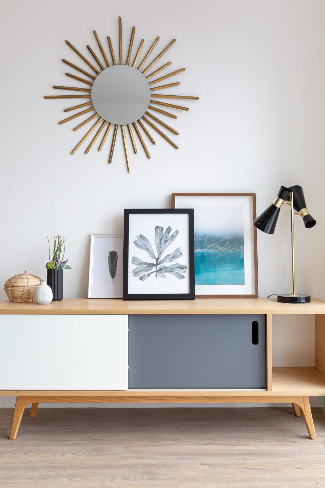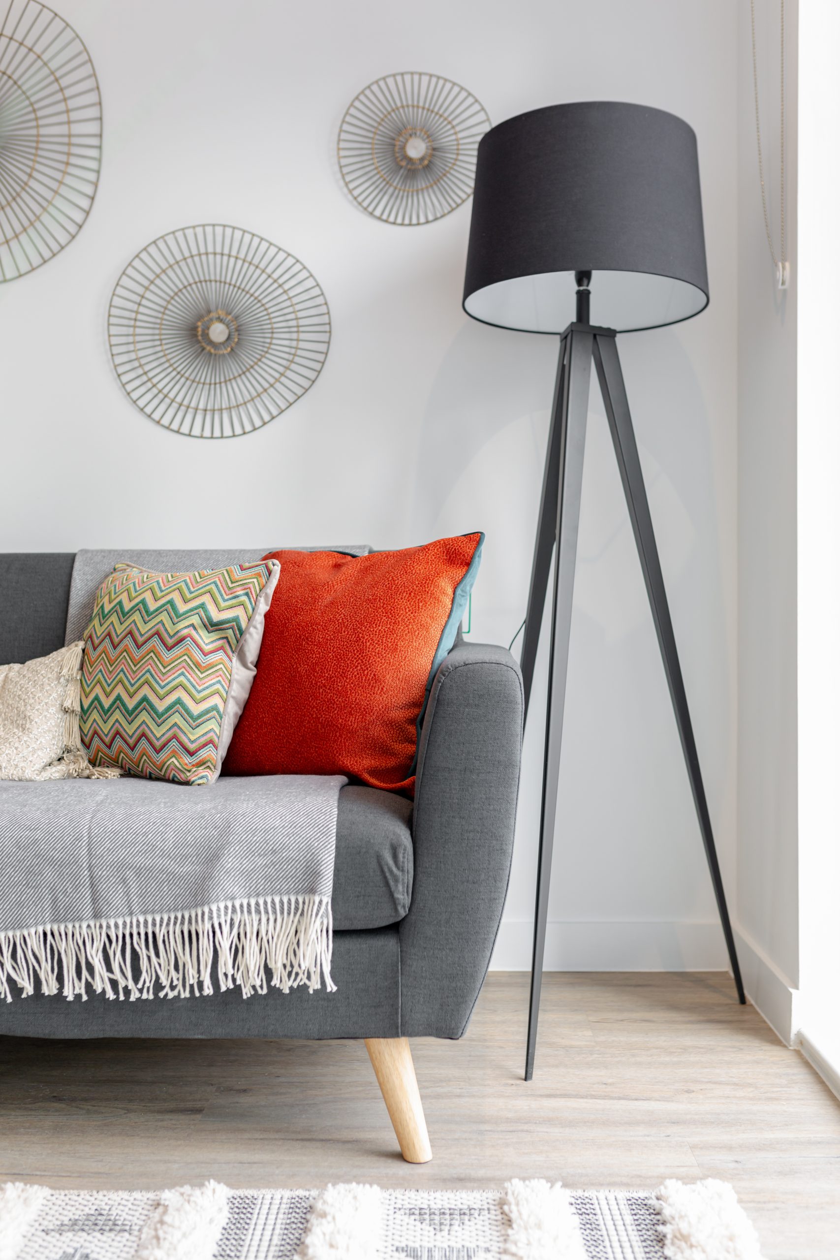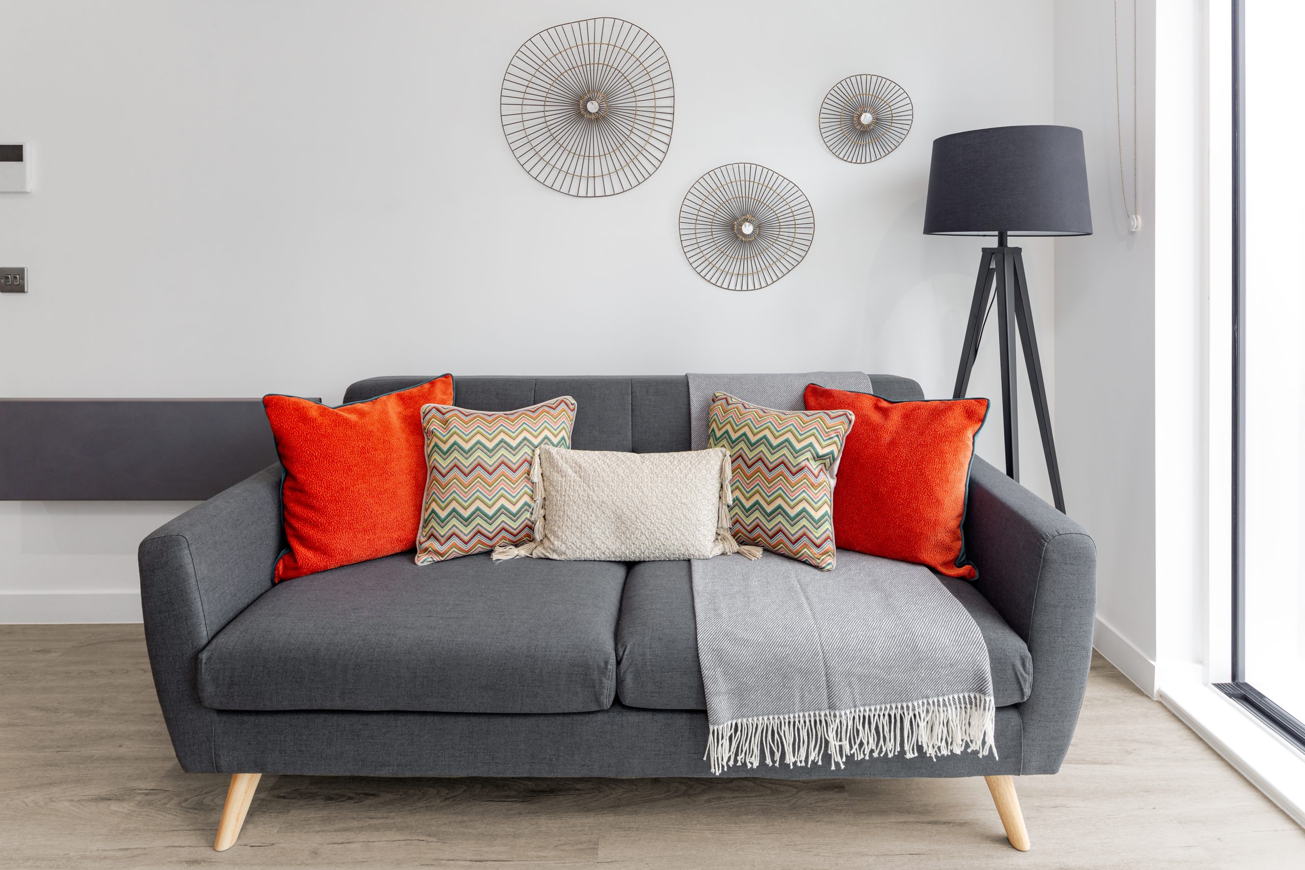 Throughout the property, a cohesive scheme of neutral upholstery, light wood finishes, and durable, space-efficient furniture has been used to deliver a stylish, move-in-ready home.