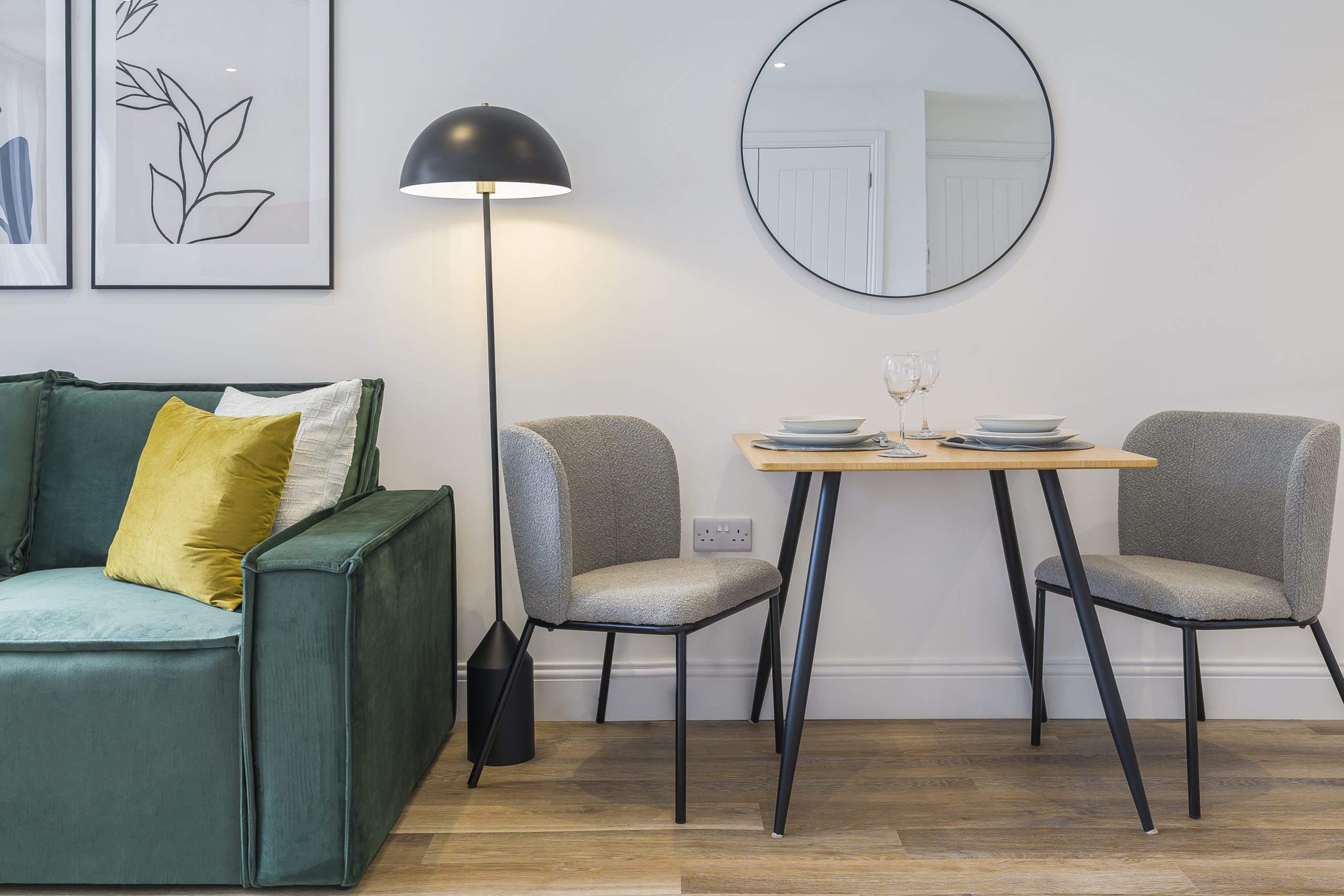 A compact dining set with a natural wood table and upholstered chairs provides a comfortable area for guests to dine or work, perfectly suited to the apartment’s layout. Contemporary black floor lighting and minimalist wall art help to frame the seating area and add depth without overwhelming the space.