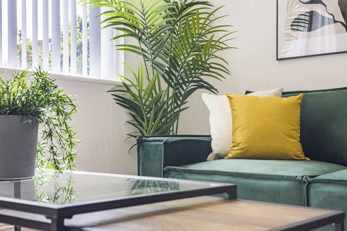 The open-plan living space features a luxurious green velvet sofa complemented by mustard and neutral scatter cushions, introducing rich colour while maintaining a refined aesthetic. A glass-top nesting coffee table set with black metal frames adds a modern industrial touch while keeping the space light and uncluttered.