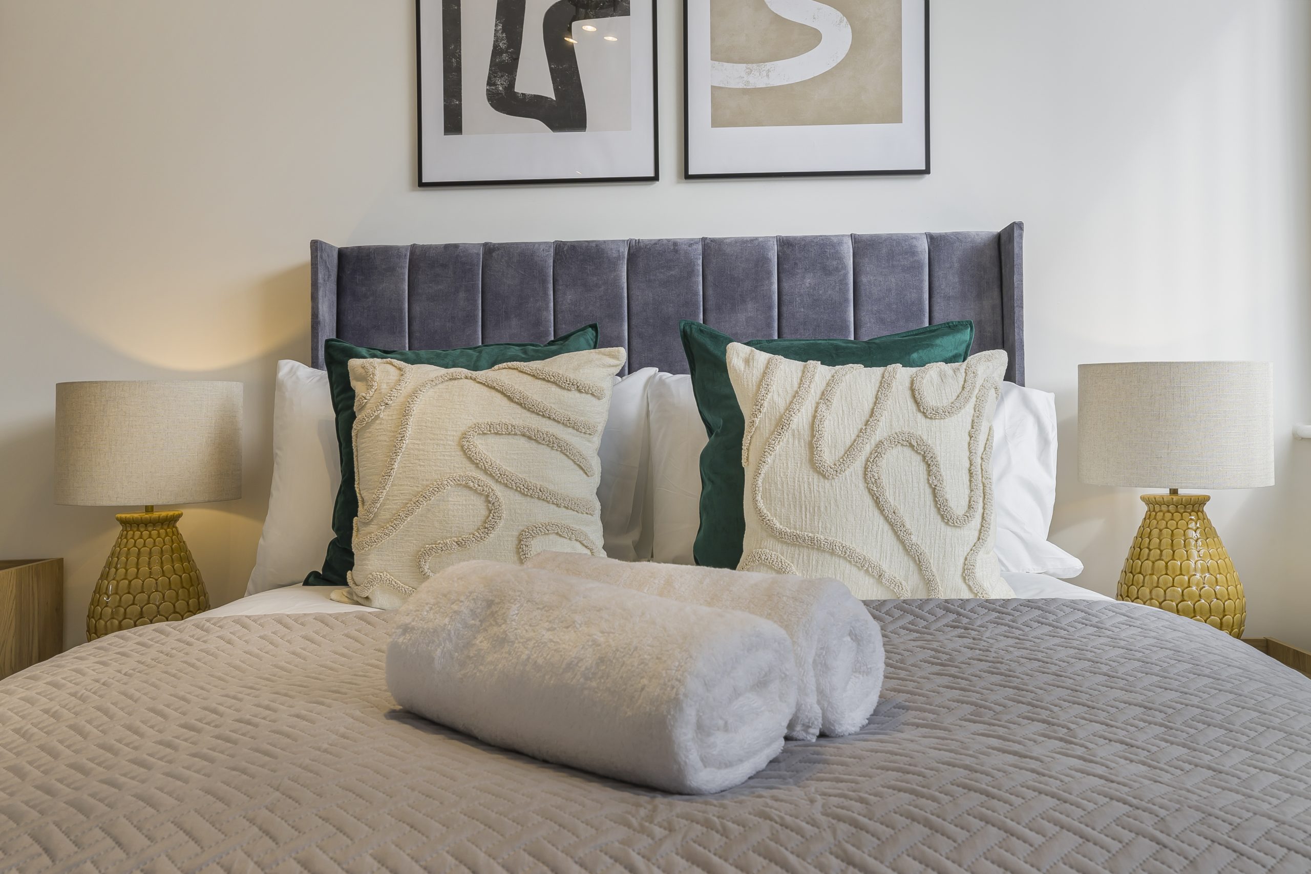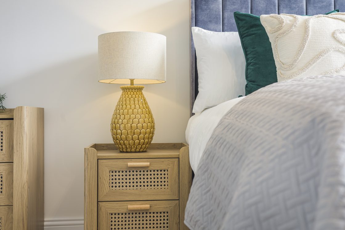 A statement ceramic bedside lamp and subtle decorative elements complete the look, creating a restful and welcoming space for guests.